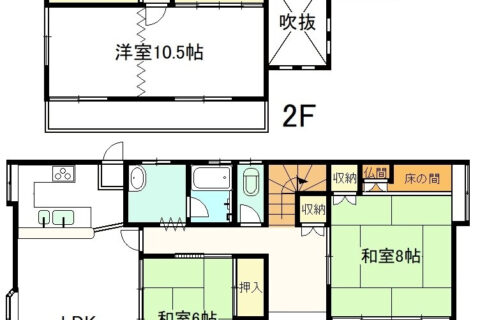 | 間取り詳細 | 1階 居間、台所、風呂、トイレ、和室8畳・6畳 2階 トイレ、和室6畳・4.5畳、洋室10.5畳 |