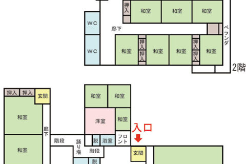 | 間取り詳細 | 1階 玄関(2カ所)、 台所、風呂(男湯、女湯)、トイレ(3カ所)、食堂、 和室(2部屋)、 その他(フロント 風呂 和室(3部屋) 洋室(1部屋)) 2階 和室(9部屋)、トイレ(2カ所) |