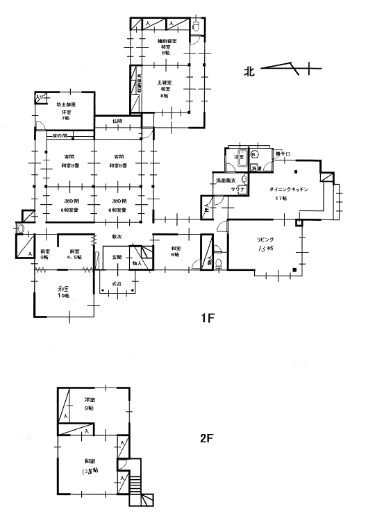 | 間取り詳細 | 1階 居間13畳、台所、風呂 、トイレ(2カ所)、 その他(3帖)、和室10畳・8畳・8畳・8畳・6畳・6畳・6畳・6畳、洋室7畳・4.5畳 2階 和室12.5畳、洋室9畳 |