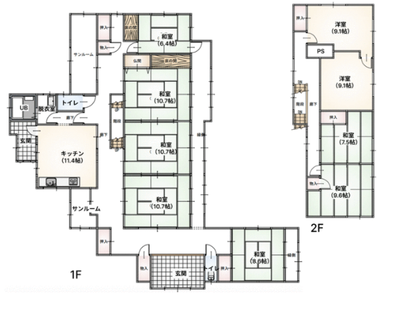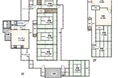 | 間取り詳細 | 1階 台所、風呂、トイレ(2カ所)、和室10.7畳・10.7畳・10.7畳 ・8.6畳・6.4畳 2階 和室9.6畳・7.5畳、洋室9.1畳・9.1畳 |