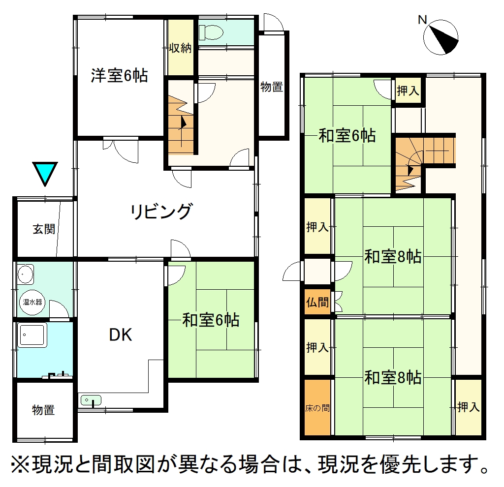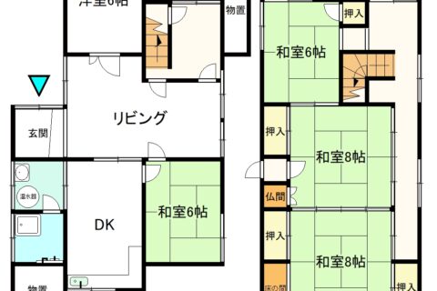 | 間取り詳細 | 1階 居間10畳、台所、風呂、トイレ、和室6畳、洋室6畳 2階 和室6畳・8畳・8畳 |