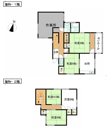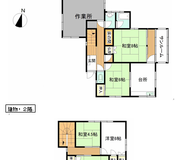 | 間取り詳細 | 1階 居間4.5畳、台所、風呂、トイレ、作業場、和室6畳・8畳 2階 和室4.5畳・6畳、洋室6畳 |