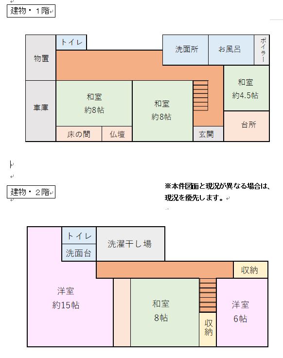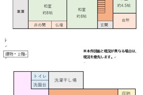 | 間取り詳細 | 1階 台所、風呂、トイレ、物置、和室約8畳・約8畳・ 約4.5畳 2階 トイレ、和室8畳、洋室15畳・6畳 |