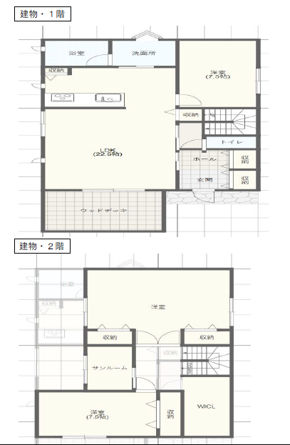 | 間取り詳細 | 1階 LDK22.5畳、風呂、トイレ、洋室7.5畳 2階 洋室7.5畳・1部屋、サンルーム、ウォークインクローゼット |