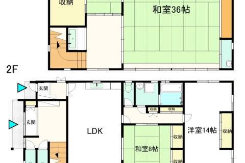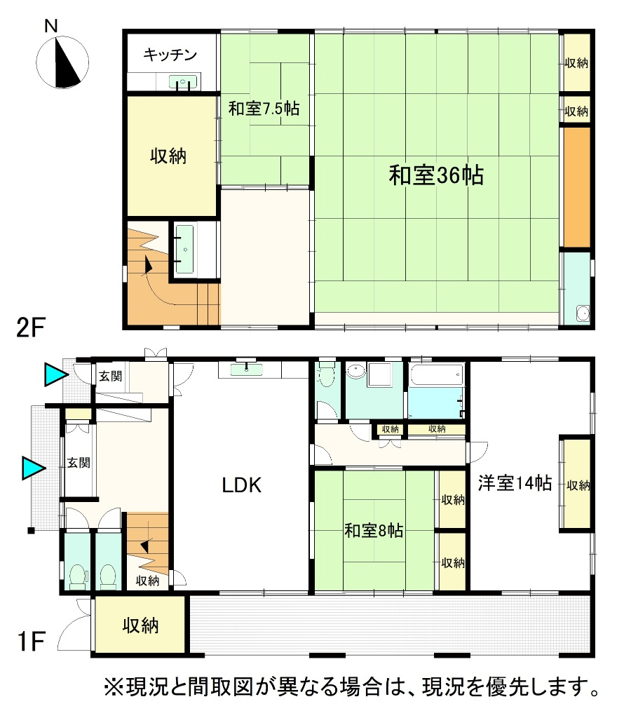 | 間取り詳細 | 1階 台所、風呂、トイレ(3カ所)、 その他(玄関2カ所)、和室8畳、洋室14畳 2階 台所 、納戸6畳 、洗面、和室7.5畳・36畳 |