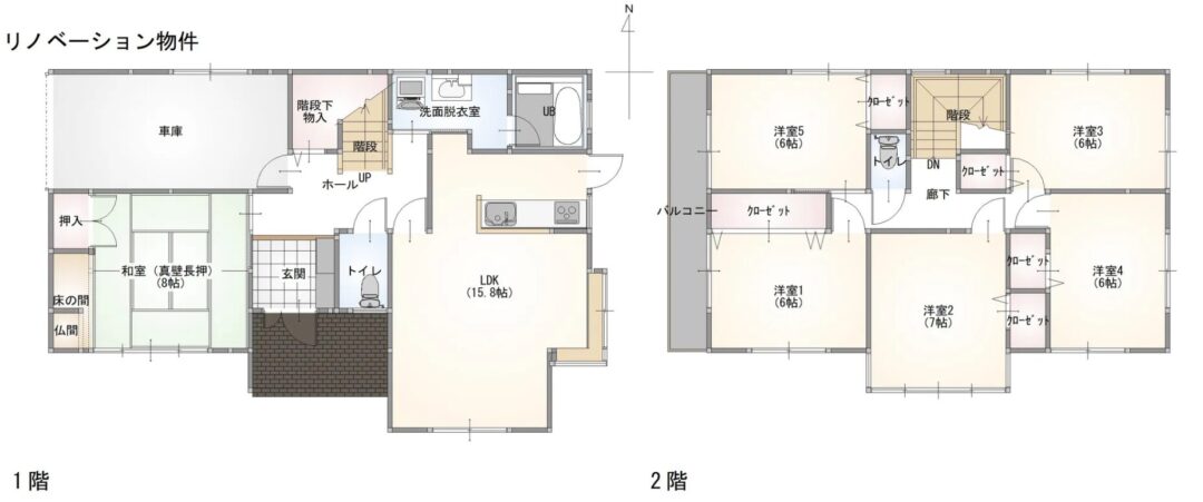 | 間取り詳細 | 1階 居間16畳、台所、風呂、トイレ、和室8畳 2階 洋室6畳・7畳・6畳・6畳・6畳 |