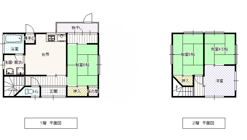 | 間取り詳細 | 1階 台所、 風呂、トイレ、和室6畳 2階 和室6畳・4.5畳、洋室4.5畳 |