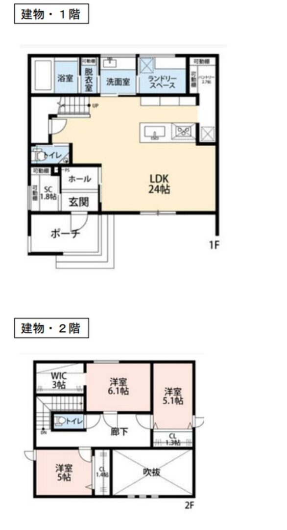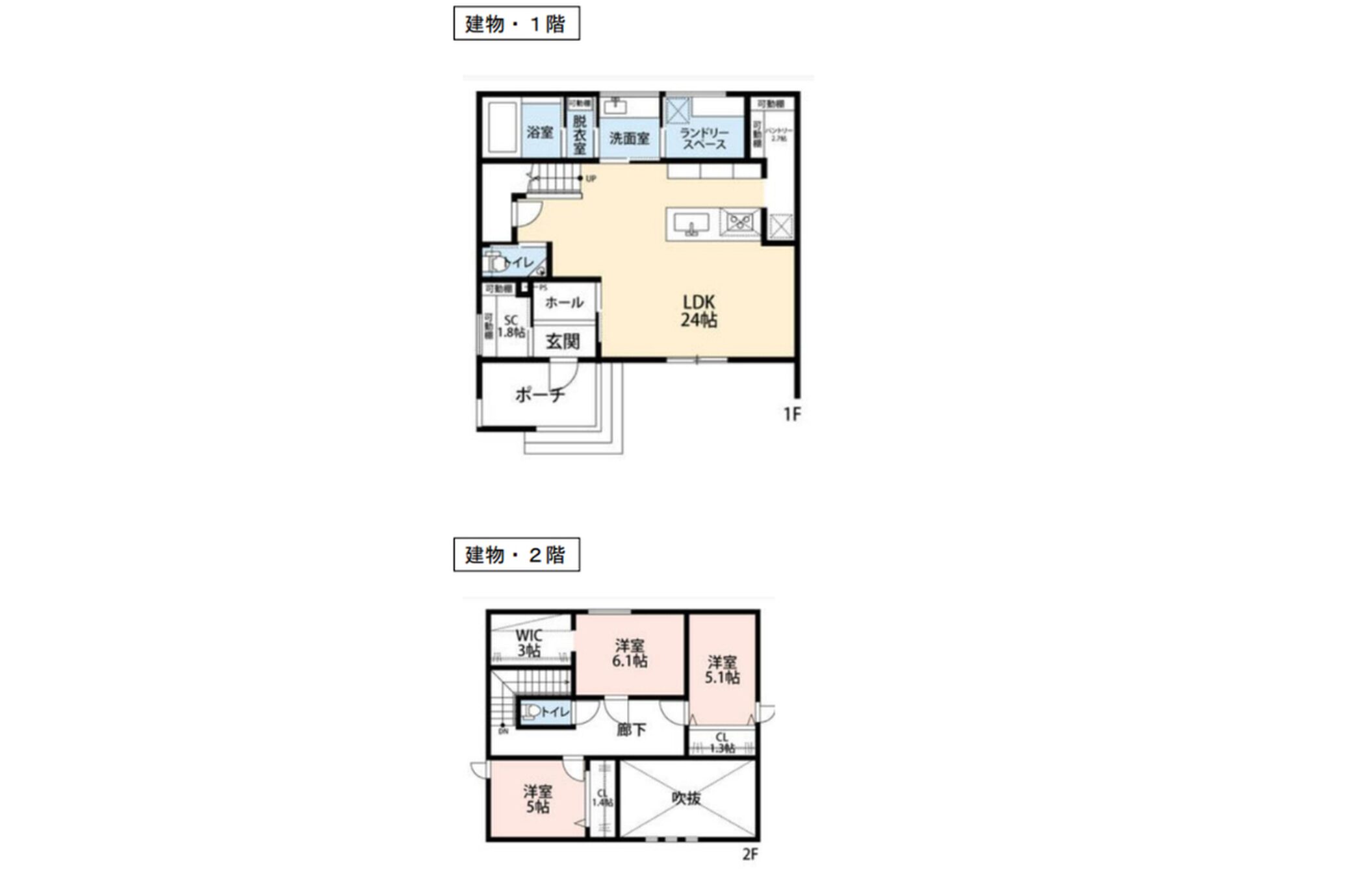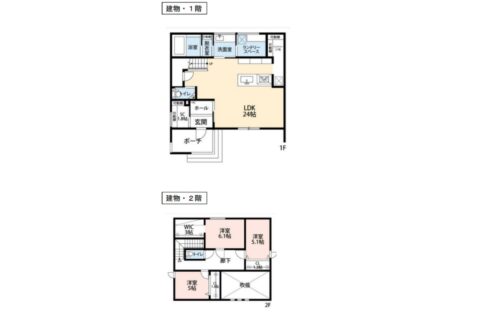 | 間取り詳細 | 1階 居間24畳、台所、風呂、トイレ 2階 トイレ、洋室5畳・5.1畳・6.1畳 |