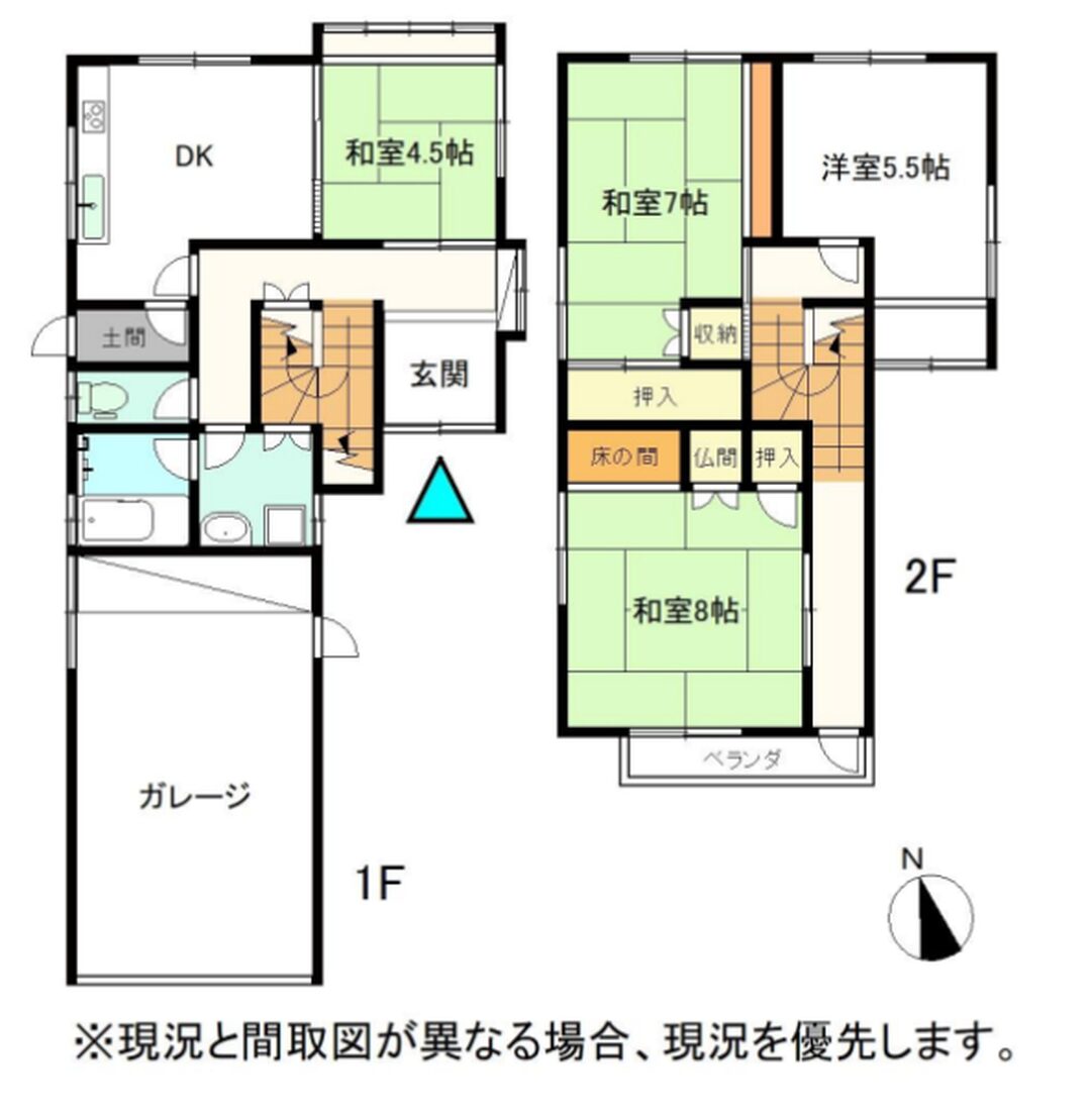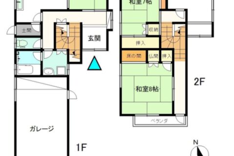 | 間取り詳細 | 1階 DK、風呂、トイレ、和室4.5畳、ガレージ 2階 和室7畳・8畳、洋室5.5畳 |