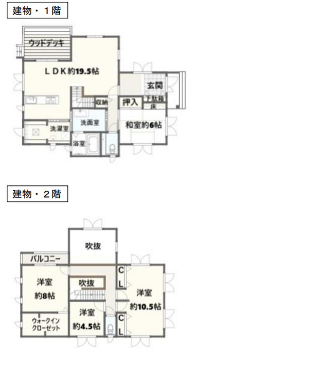| 間取り詳細 | 1階 LDK19.5畳、風呂、トイレ、洗面、和室6畳、ランドリールーム 2階 洋室10.5畳・8畳・4.5畳、トイレ |