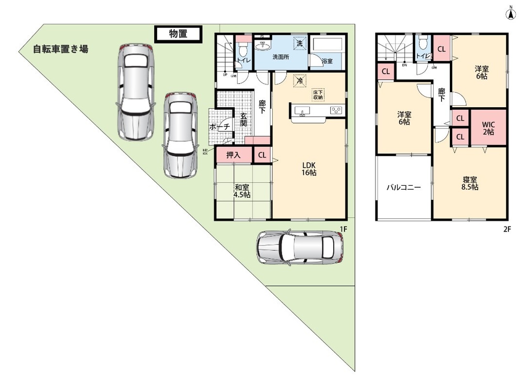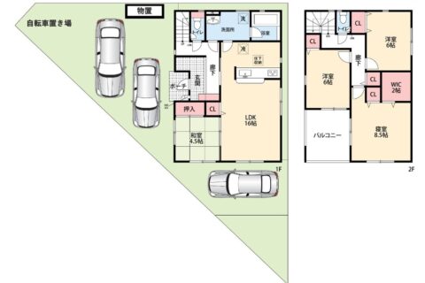 | 間取り詳細 | 1階 居間16畳、台所、風呂、トイレ、和室4.5畳 2階 和室6畳・6畳・8.5畳、トイレ |